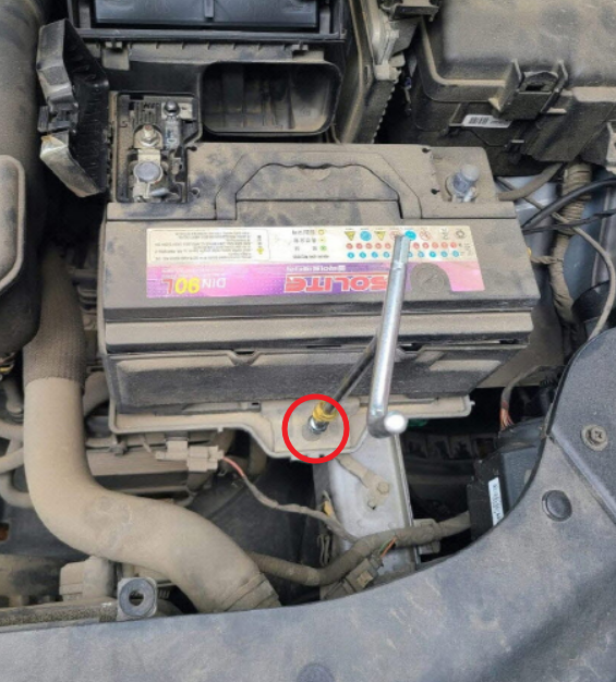 배터리의 고정 브래킷 볼트는 12mm T복스 핸들 렌치로 풀어주고 탈거하세요.