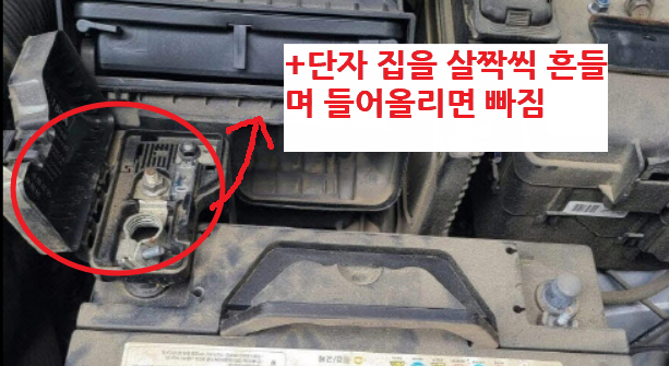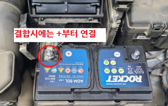 새 배터리를 설치한 후, 플러스(+) 단자를 먼저 연결하고 그다음 마이너스(-) 단자를 연결해 주세요.