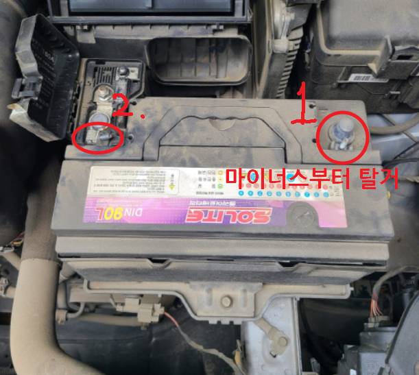 기존 배터리의 마이너스(-) 단자를 분리한 뒤 플러스(+) 단자를 분리해 주세요. 이는 배터리 교체 시 전기적 쇼트를 방지하는 기본 안전수칙입니다.